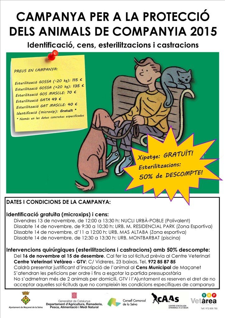 L'agenda del CAASCampanya per a la Protecció desl Animals de Companyia a Maçanet de la SelvaDivendres 13 de novembre de 2015El proper 13 i 14 de novembre l'Ajuntament de Maçanet de la Selva i el Consell Comarcal de la Selva duran a terme una nova campanya d'identificació, cens i estirilització de gossos i gats al municipi. Destacar que, per primer cop, els xips i el cens municipal serà totalment gratuït, d'altra banda es podran esterilitzar els gossos i gats amb uns descomptes de fins el 50% gracies a la participació del Grup Tècnic Veterinari de Maçanet i a la col·laboració de la Direcció General de Medi Naturak de a Generalitat de Catalunya.